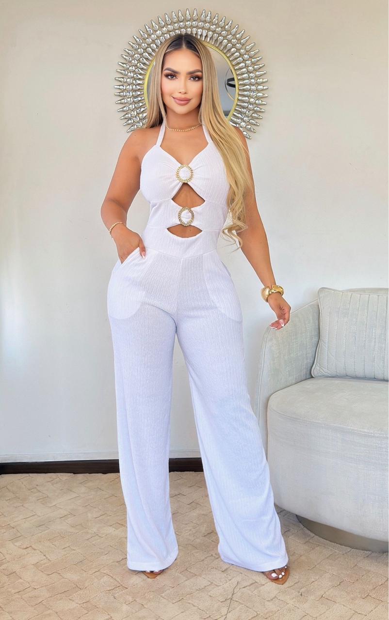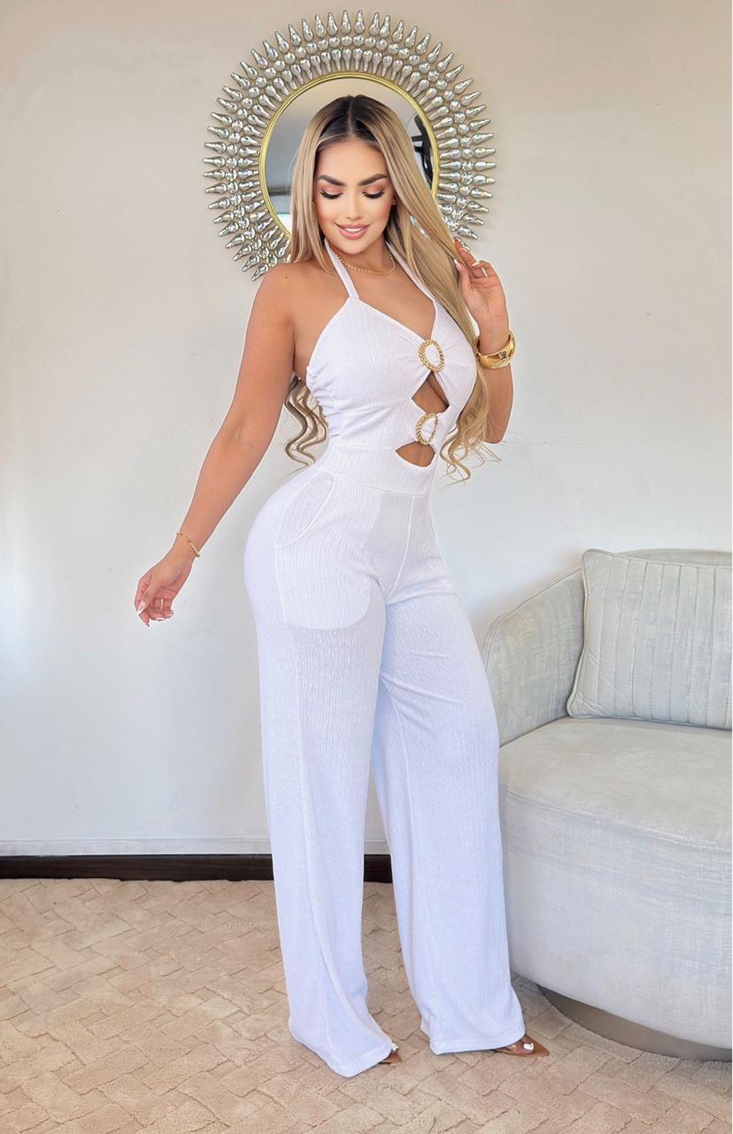 Enterizo bota recta con bolsillos, blusa cruzada de tiras con herraje