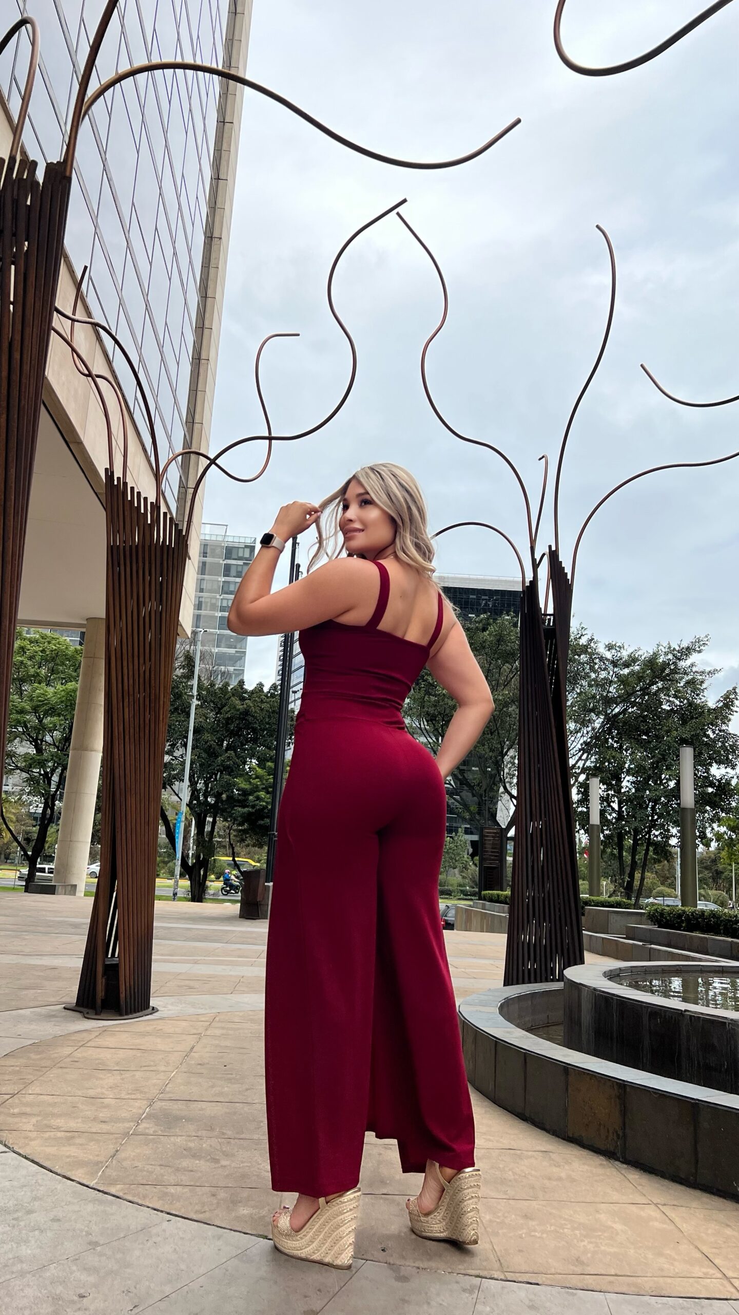 Enterizo bota recta con bolsillos, blusa cruzada de tiras con herraje