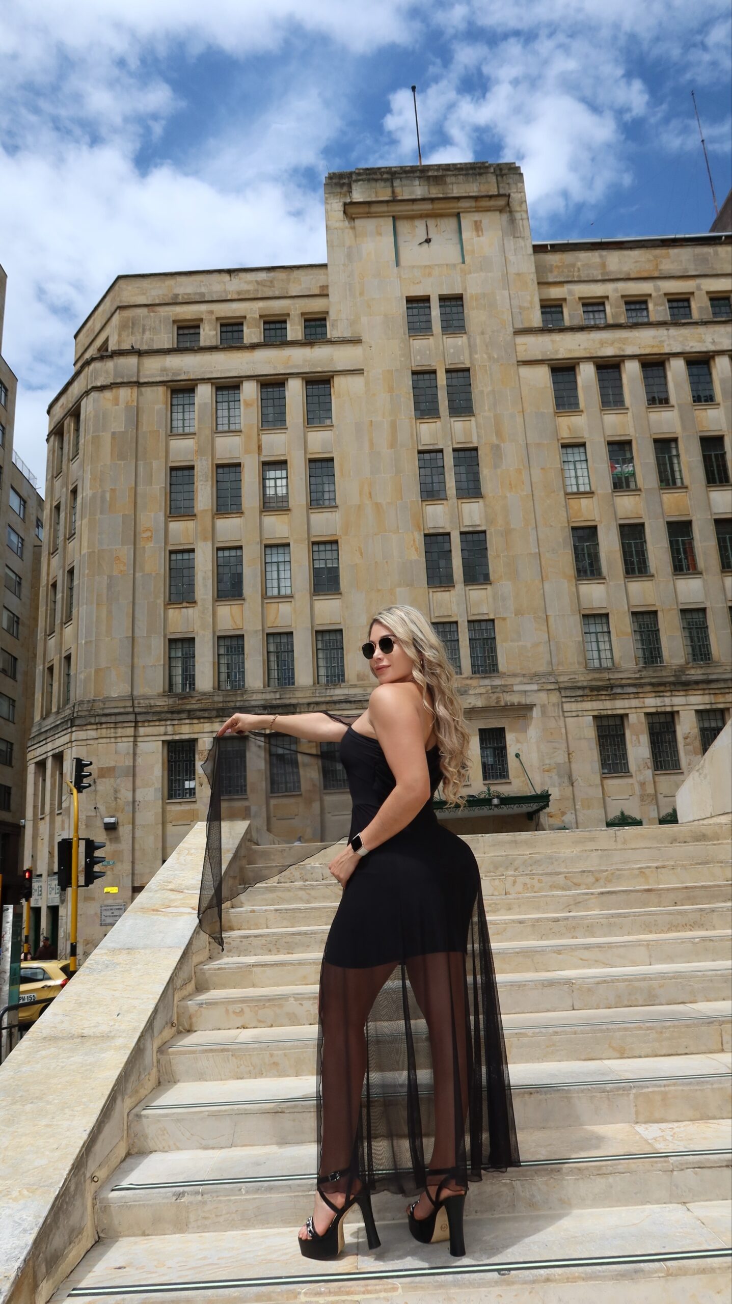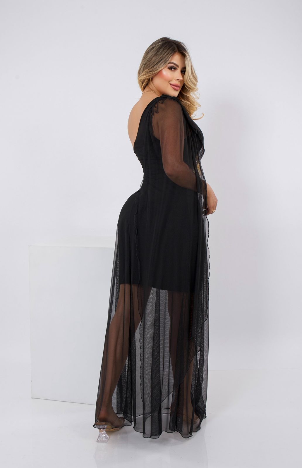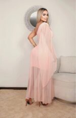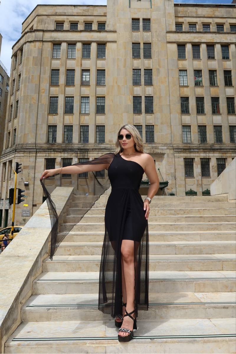 Vestido aimétrico de un solo hombro con caída en mallatext