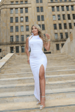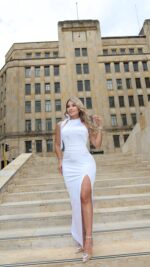 Vestido largo cuello tortuga de amarrar al cuello en satin, con abertura en la pierna
