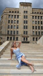 Vestido largo en satin con abertura y pliegues en la falda, blusa con brillo