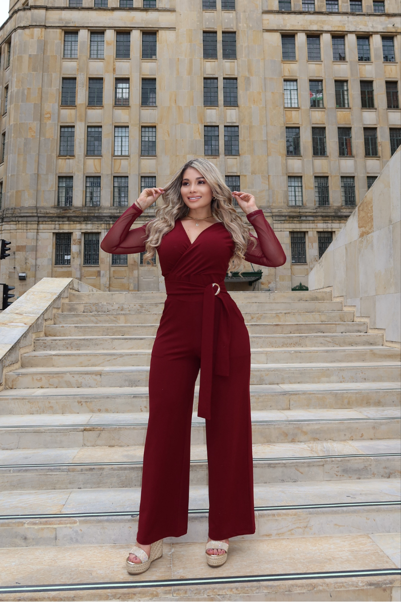 Enterizo bota recta, blusa cruzada, con mangas en mallatex