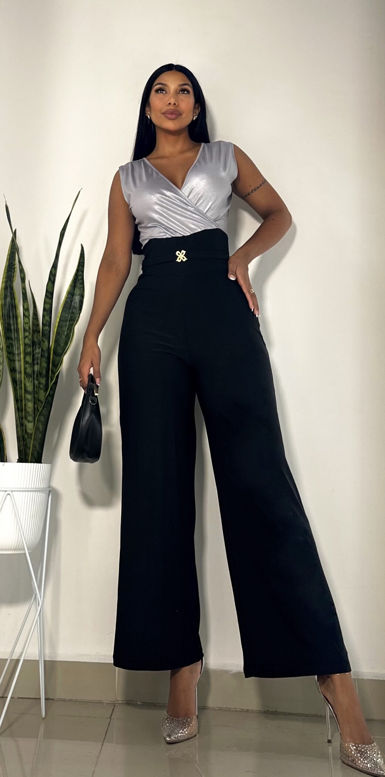 Enterizo bota recta, blusa cruzada, con mangas en mallatex