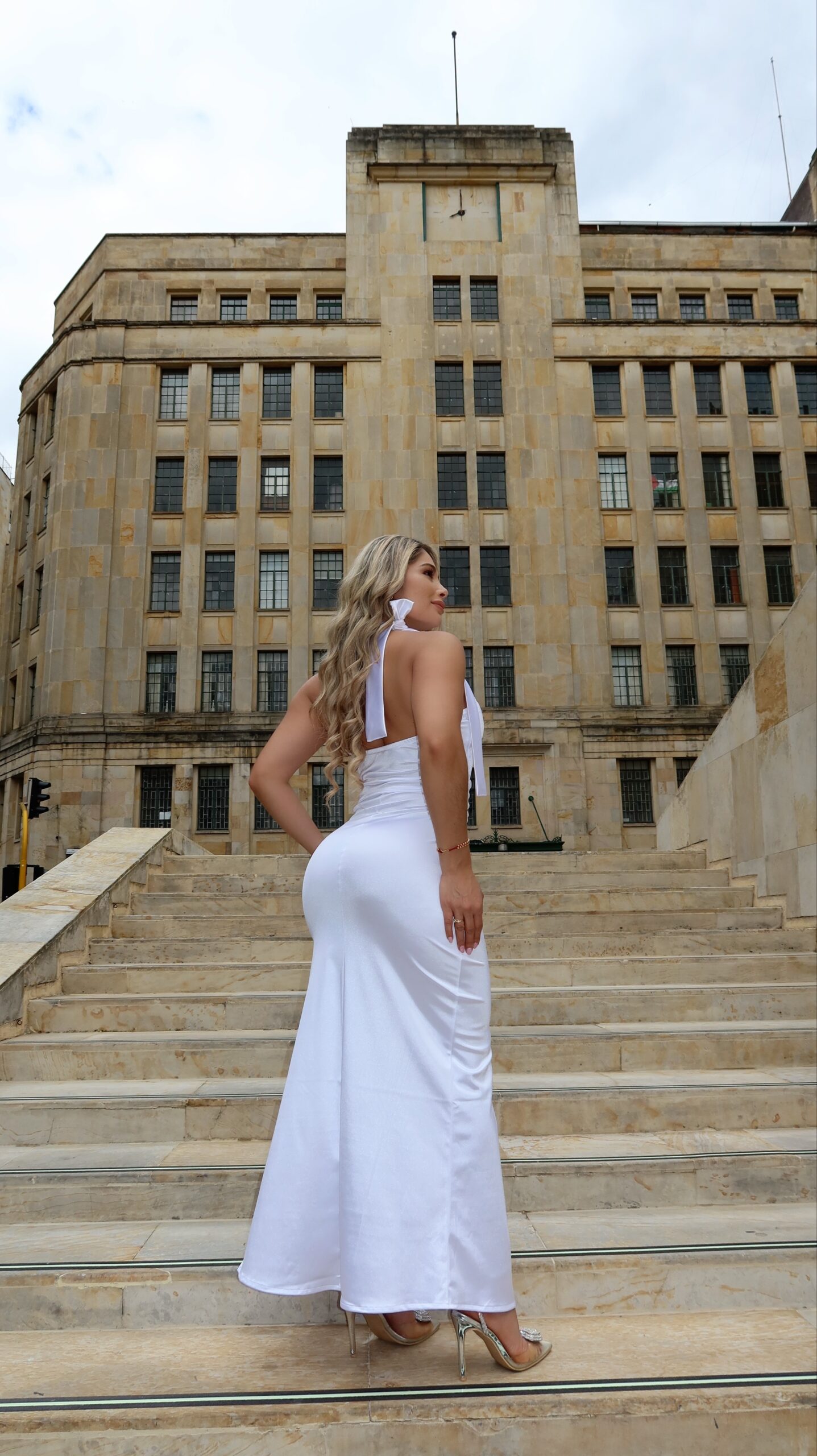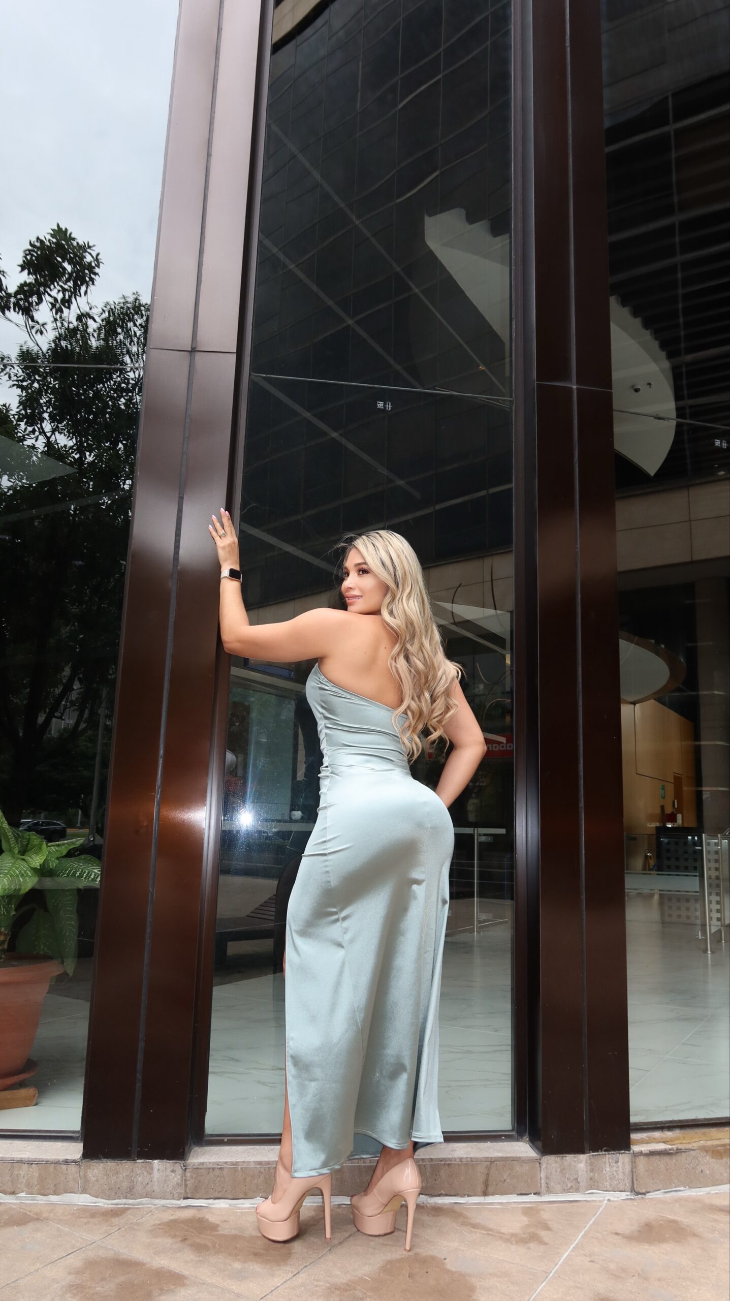 Vestido largo cuello tortuga de amarrar al cuello en satin, con abertura en la pierna