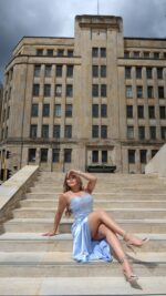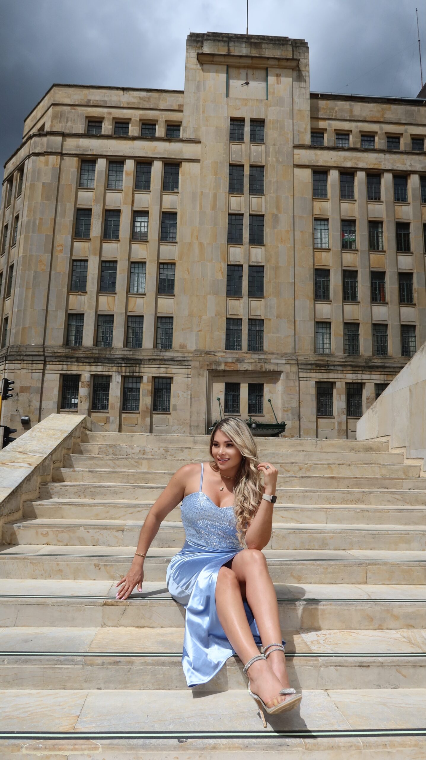 Vestido largo en satin con abertura y pliegues en la falda, blusa con brillo